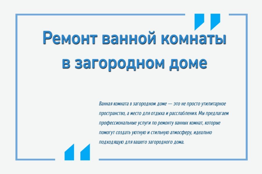 Ванная комната в загородном доме — это не просто утилитарное пространство, а место для отдыха и расслабления. Мы предлагаем профессиональные услуги по ремонту ванных комнат, которые помогут создать уютную и стильную атмосферу, идеально подходящую для вашего загородного дома.